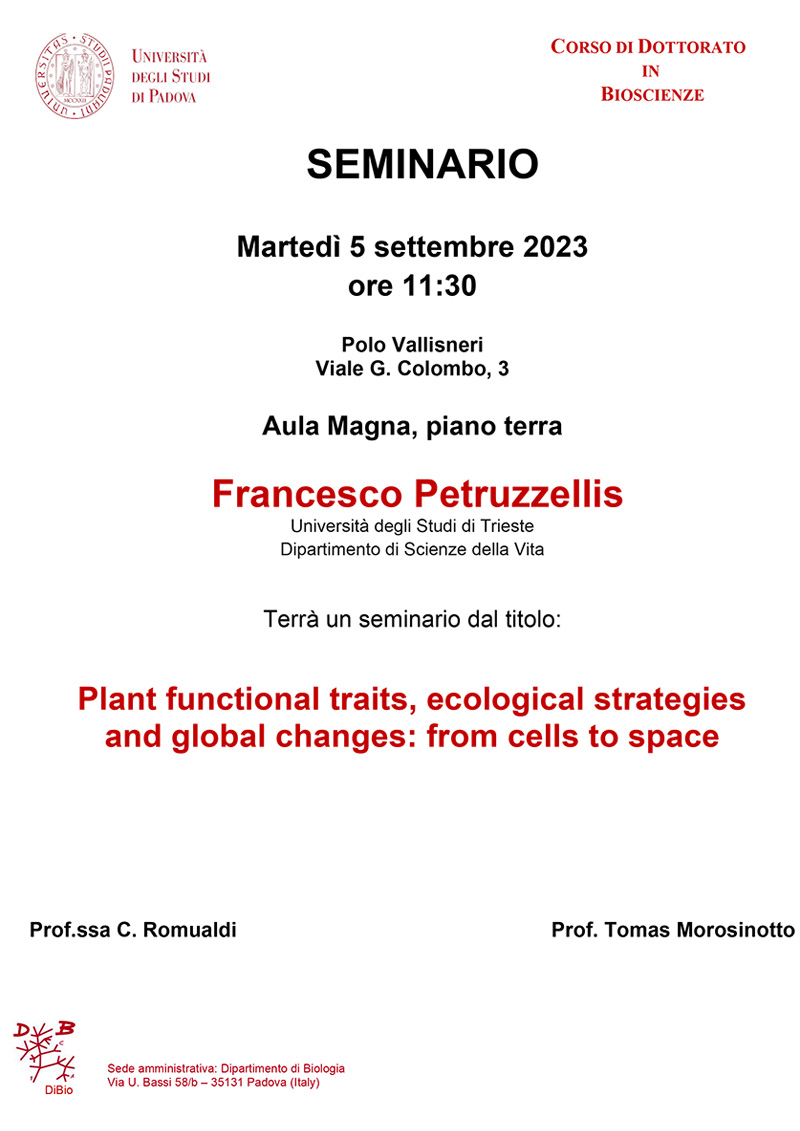 Dott. Francesco Petruzzellis, Università degli Studi di Trieste, Dipartimento di Scienze della Vita, “Plant functional traits, ecological strategies and global changes: from cells to space”