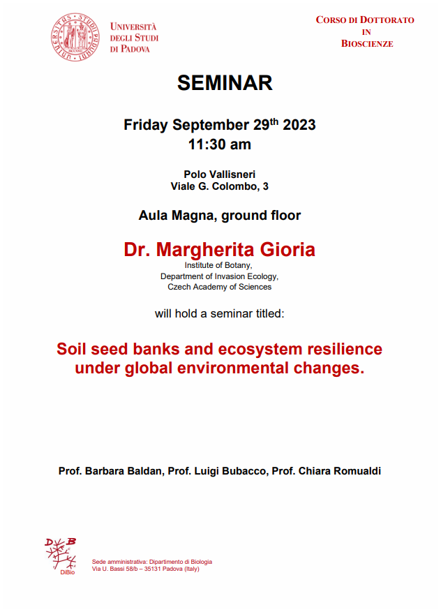 Dott.ssa Margherita Gioria, Institute of Botany of Department of Invasion Ecology, Czech Academy of Sciences, “Soil seed banks and ecosystem resilience under global environmental changes”;