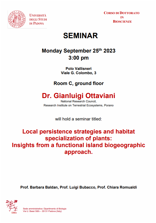 Dott. Gianluigi Ottaviani, National Research Council, Research Institute on Terrestrial Ecosystems, Porano, “Local persistence strategies and habitat specialization of plants: Insights from a functional island biogeographic approach”